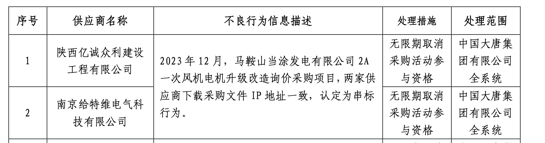 公告显示,2023 年 12 月,马鞍山当涂发电有限公司 2A 一次风机电机升级改造询价采购项目,陕西亿诚众利建设工程有限公司以及南京给特维电气科技有限公司两家供应商下载采购文件IP地址一致,认定为串标行为。