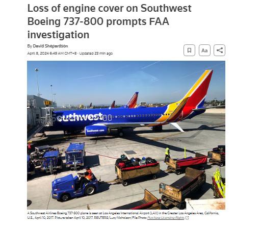 中新网4月8日电 据路透社报道,当地时间4月7日上午,美国西南航空公司一架从科罗拉多州丹佛飞往得克萨斯州休斯敦的波音737-800型客机在起飞过程中,发动机罩发生脱落。