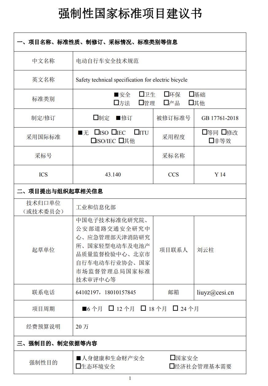 据工信部网站4月7日消息,工信部科技司公开征集对《电动自行车安全技术规范》强制性国家标准修订计划项目的意见。本标准主要技术内容包括车速限值、限速器防篡改、整车安全、蓄电池充电器互认、机械安全、耐高温识别代码标识、电气安全、防火等要求和试验方法。