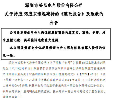3月15日,盛剑明因违规减持被深圳证监局责令改正。随后,深交所对盛剑明下发监管函。资料显示,盛剑明目前是盛弘股份的第二大股东。