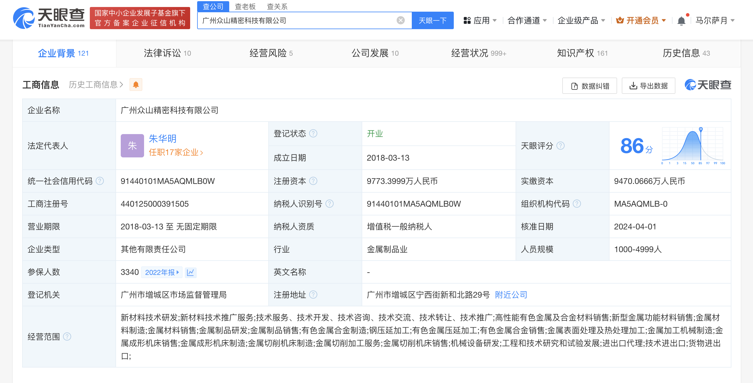 广州众山精密科技有限公司成立于2018年3月,法定代表人为朱华明,经营范围含新材料技术研发、高性能有色金属及合金材料销售、金属材料制造、钢压延加工、金属成形机床制造等。