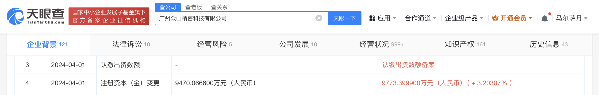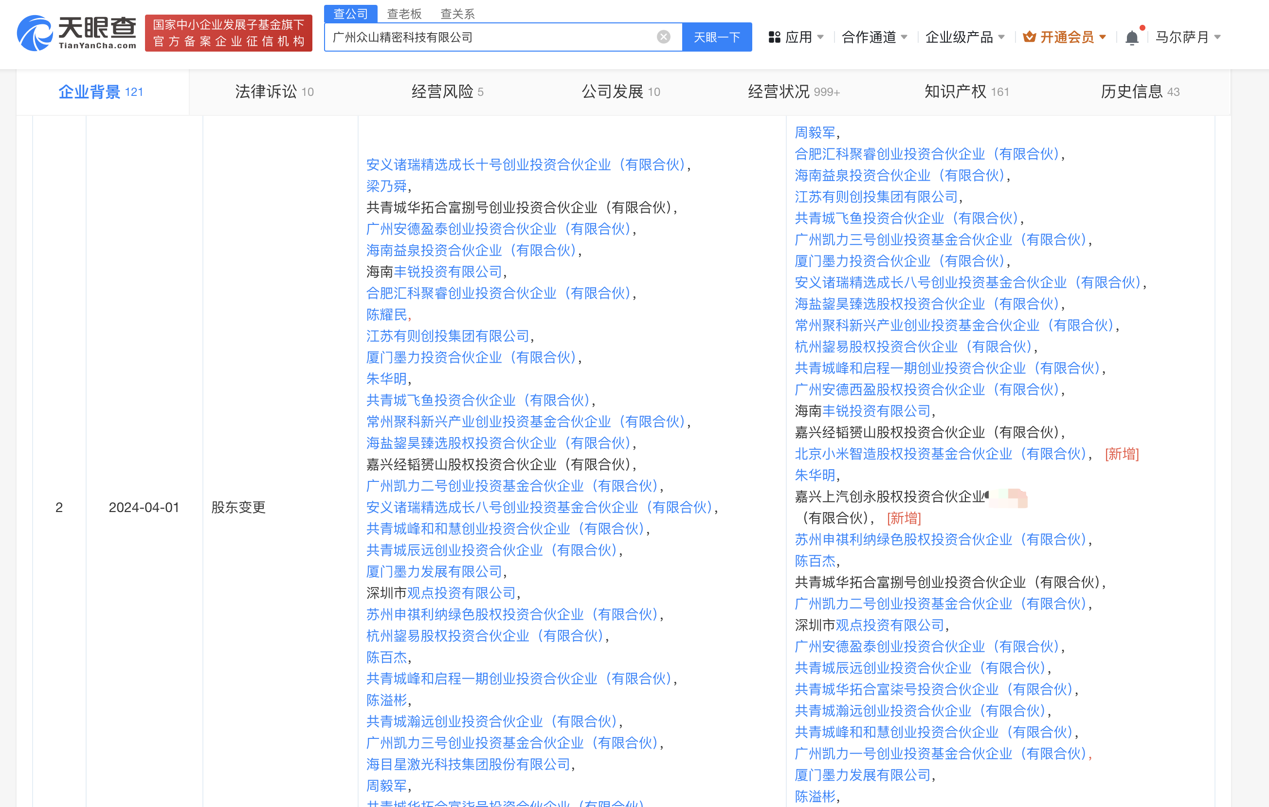 天眼查App显示,近日,广州众山精密科技有限公司发生工商变更,新增小米旗下北京小米智造股权投资基金合伙企业(有限合伙)、上汽旗下嘉兴上汽创永股权投资合伙企业(有限合伙)为股东,同时,注册资本由约9470万人民币增至约9773万人民币。