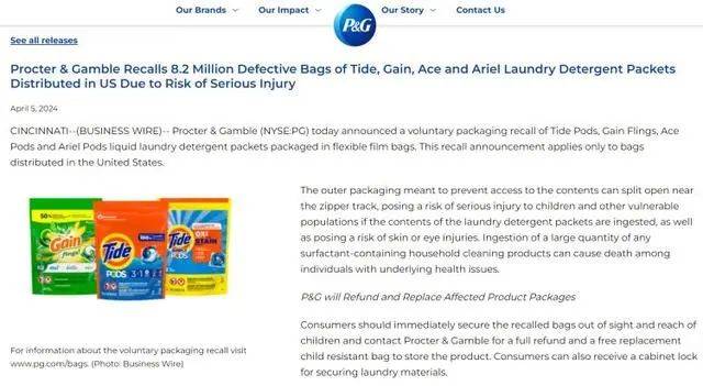据宝洁公司及美国和加拿大产品安全监管机构发布的通知,召回的原因是洗衣粉的儿童安全包装存在问题。路透社报道指出,外包装可能会在拉链轨道附近裂开,使儿童暴露在洗涤剂的化学物质中,进而会导致癫痫发作、昏迷、严重的呼吸障碍、眼睛损伤和烧伤。