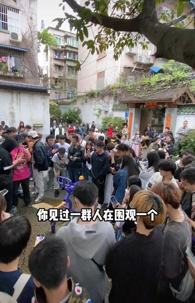 据网友发布的视频显示,该居民区楼下的健身器材场地被众人围住排队打卡拍照。有不少人在唱歌或大喊口号,还有人进行现场直播。