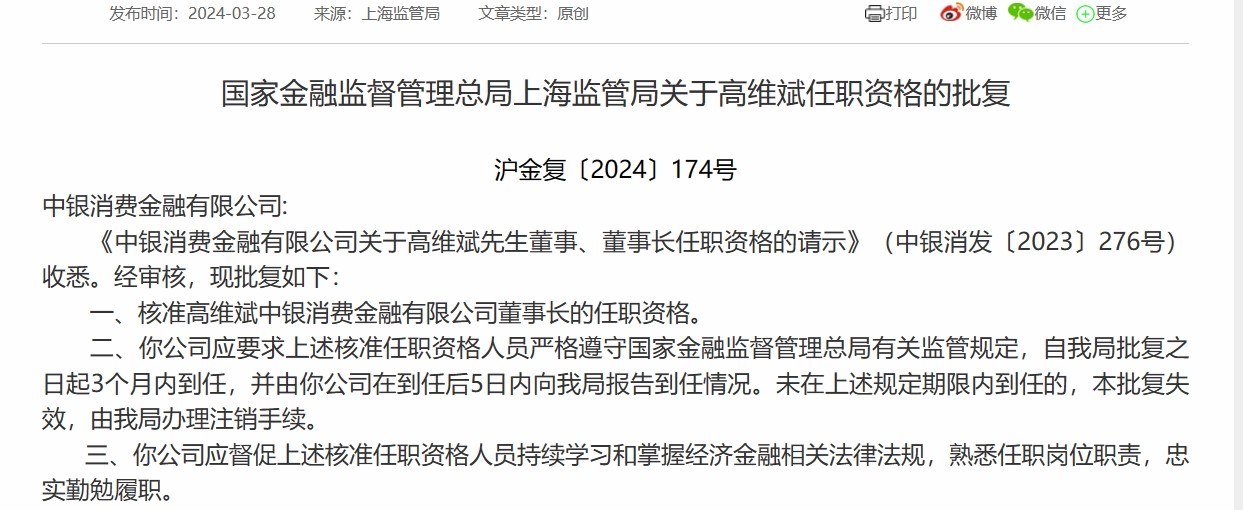 近日,国家金融监督管理总局发布公告,核准了高维斌中银消费金融有限公司(下称“中银消费金融”)董事长的任职资格。这是近一年来中银消费金融第三位换新的高管。