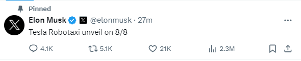 马斯克在社交媒体平台X上发文称,特斯拉计划8月8日推出无人驾驶出租车(robotaxi)。