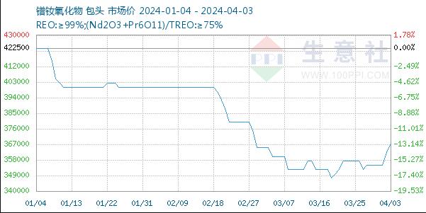今年以来,稀土价格整体下行,但是近期小有反弹。生意社的数据显示,4月3日国内轻稀土市场价格走势上涨,金属镨钕价格上涨5000元/吨至45.25万元/吨,镨钕氧化物价格上涨5000元/吨至36.75万元/吨,氧化钕价格上涨5000元/吨至36.75万元/吨,金属钕价格上涨5000元/吨至47.75万元/吨,金属镨价格上涨1.5万元/吨至52元/吨,氧化镨价格上涨1万元/吨至37.75万元/吨,国内轻稀土部分价格上涨,场内走销情况正常,下游采购情况一般,生意社预计后期价格走高为主。