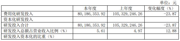 2023年公司研发费用为8018.64万元,相比2022年的1.05亿元下滑23.87%,但是研发投入占营业收入的比例却由2022年的4.97%提高到5.61%。