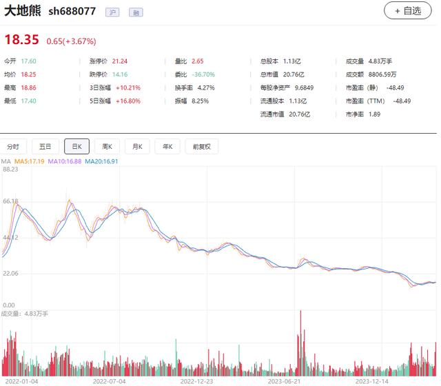 在二级市场上,公司上市后股价经历了大涨,但是自2022年8月以来股价持续震荡走低。截至4月3日收盘,大地熊股价18.35元/股,总市值20.76亿元。同花顺iFinD数据显示,今年以来,公司股价下跌超23%,2023年以来股价下跌超47%。