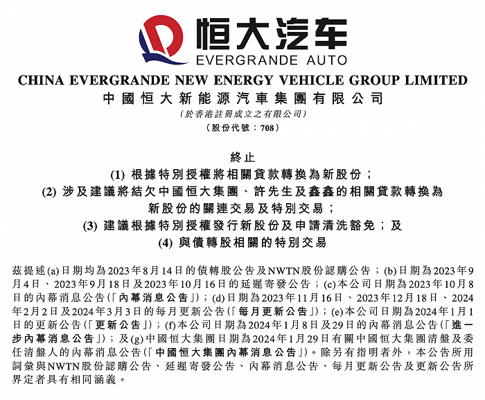 4月5日,恒大汽车在港交所公告,于本公告日期,拟议交易及债转股的条款修订尚未取得任何进一步进展。公司确认,拟议交易及债转股将不再进行。由于股份认购不再进行,根据收购守则规则26,认购人概无义务就其及与其一致行动人士尚未拥有或同意收购的所有已发行股份提出无条件强制性全面要约。公司将不会向执行人员提出申请,寻求其同意特别交易。