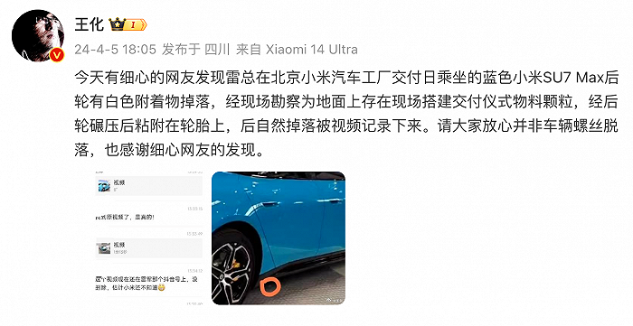 4月5日消息,有网友发现雷军在北京小米汽车工厂交付日乘坐的蓝色小米SU7 Max后轮有白色附着物掉落。对此,小米集团公关部总经理王化发文回应称,“经现场勘察为地面上存在现场搭建交付仪式物料颗粒,经后轮碾压后粘附在轮胎上,后自然掉落被视频记录下来。请大家放心并非车辆螺丝脱落,也感谢细心网友的发现。 ”