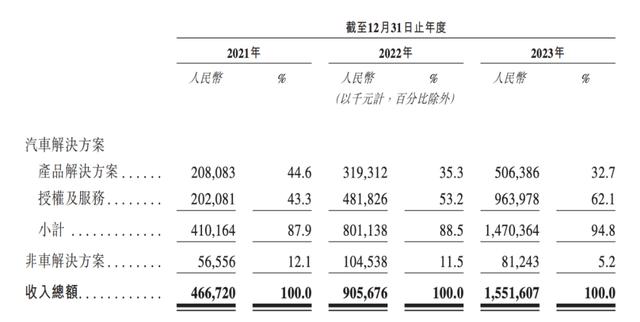 地平线主要营收来自“汽车解决方案”,即向车企提供的智驾处理硬件,与专有算法及软件结合的方案。它包括,产品解决方案和授权及服务,后者指的是地平线的算法软件使用许可授权。