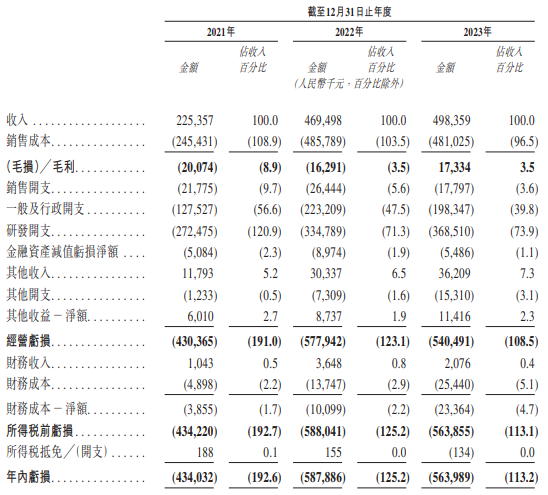 此次港股上市,2021年-2023年(下称“报告期”),纵目科技营收分别为2.25亿元、4.70亿元及4.98亿元,净利润分别为-4.34亿元、-5.88亿元、-5.64亿元。