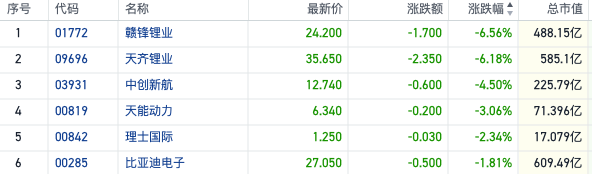 今日港股锂电板块集体下挫,跌幅居于市场前列。截至发稿,天齐锂业(09696.HK)、赣锋锂业(01772.HK)两大行业龙头均跌超6%,中创新航(03931.HK)跌超4%,天能电力(00819.HK)、比亚迪电子(00285.HK)双双跟跌。