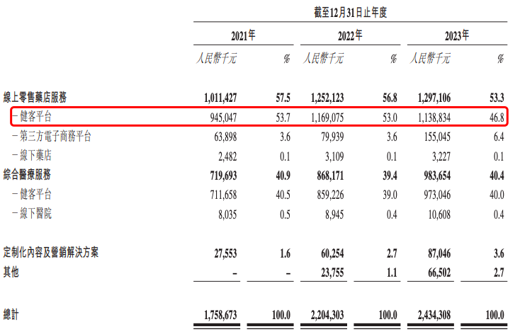 按照方舟云康招股书中分类来看“卖药”收入的变化,很明显的是在2023年,其线上零售药店收入增速仅3.59%,几乎已经陷入了增长停滞。细究来看,这部分收入来自健客平台、第三方电子商务平台和线下药店,而健客平台占比约9成,但是在2023年,来自健客平台的收入出现负增长,比上年减少了3024.1万元。