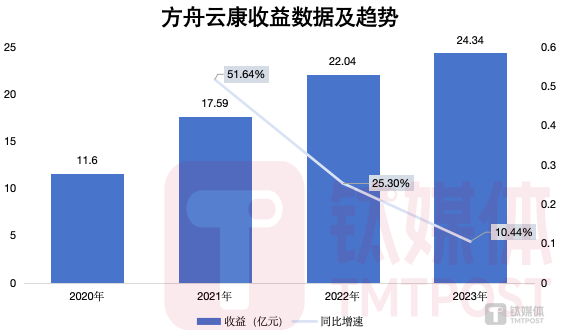 2020年至2023年,方舟云康的收入分别为11.60亿元、17.59亿元、22.04亿元和24.34亿元,近两年,公司整体收入增速下滑明显,2022年、2023年分别为25.30%、10.44%。