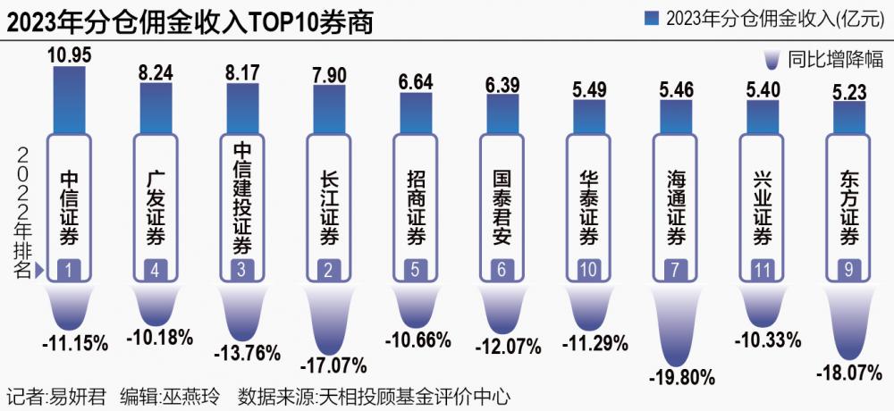 2023年分仓佣金收入排名前十的券商依次是:中信证券、广发证券、中信建投证券、长江证券、招商证券、国泰君安、华泰证券、海通证券、兴业证券、东方证券。