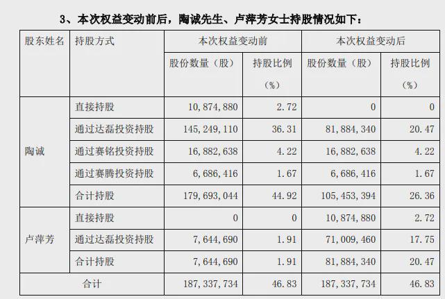 此前,陶诚通过直接持股和间接持股的方式合计持有公司约1.80亿股股票,占公司总股本的44.92%。