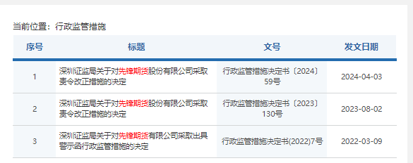 2022年3月,先锋期货就曾被深圳证监局采取出具警示函行政监管措施。深圳证监局指出,经检查,先锋期货居间人管理存在未全面落实现场检查整改要求、居间人制度不完善、居间人行为管理和居间客户异常交易监测不到位等问题。上述问题反映出先锋期货内控管理不完善,深圳证监局决定对先锋期货采取出具警示函的行政监管措施。
