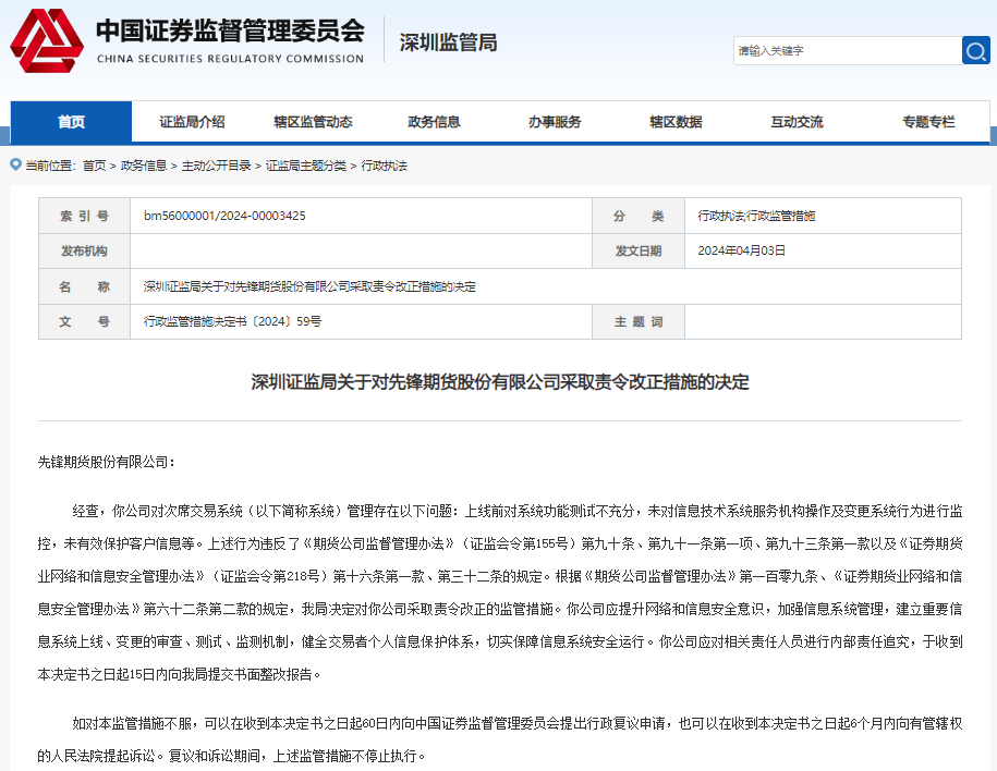 深圳证监局指出,上述行为违反了《期货公司监督管理办法》(证监会令第155号)第九十条、第九十一条第一项、第九十三条第一款以及《证券期货业网络和信息安全管理办法》(证监会令第218号)第十六条第一款、第三十二条的规定。根据《期货公司监督管理办法》第一百零九条、《证券期货业网络和信息安全管理办法》第六十二条第二款的规定,决定对先锋期货采取责令改正的监管措施。