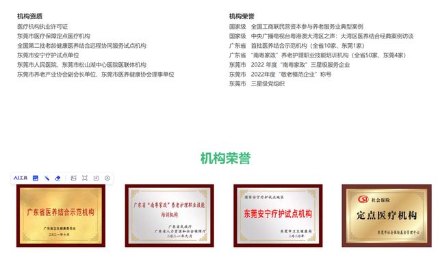 官网资料显示,东莞康怡护理院系广东省医养结合示范机构、东莞安宁疗护试点机构,拥有多项荣誉。