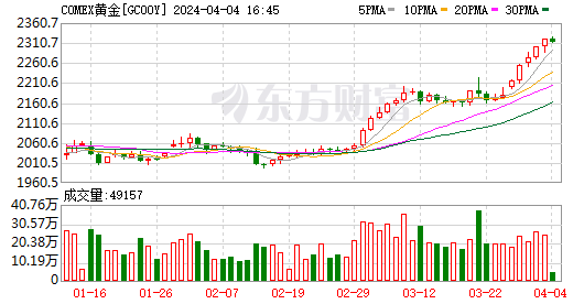 黄金再创纪录新高,COMEX 6月黄金期货收涨1.45%,报2315.00美元/盎司,续创收盘历史新高,今日早间开盘甚至一度突破2320美元/盎司。此前美联储主席杰罗姆·鲍威尔重申“今年某个时候”开始降息可能是合适之举。
