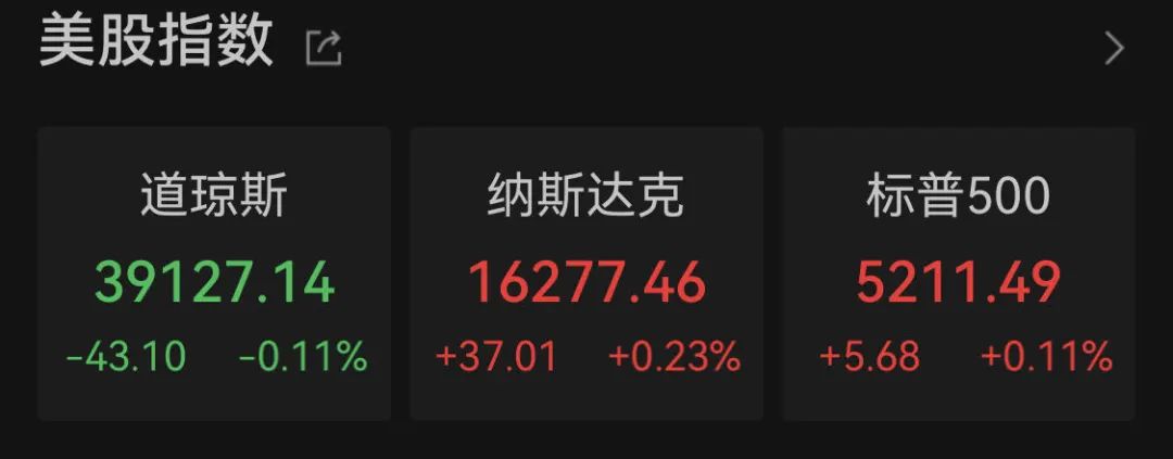 美国三大股指收盘涨跌不一。截至收盘,道指跌0.11%报39127.14点,标普500指数涨0.11%报5211.49点,纳指涨0.23%报16277.46点。