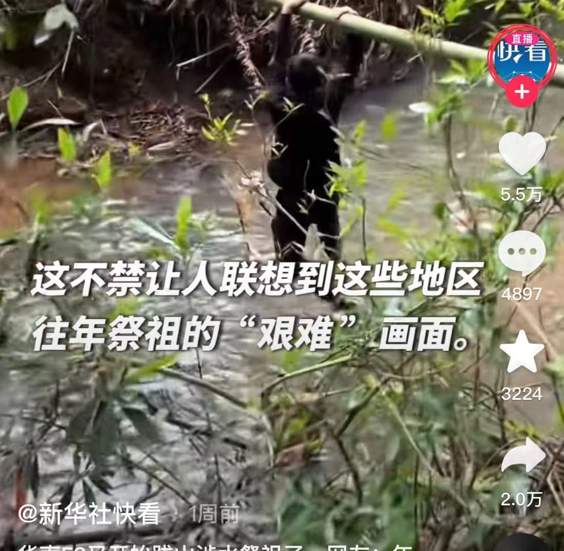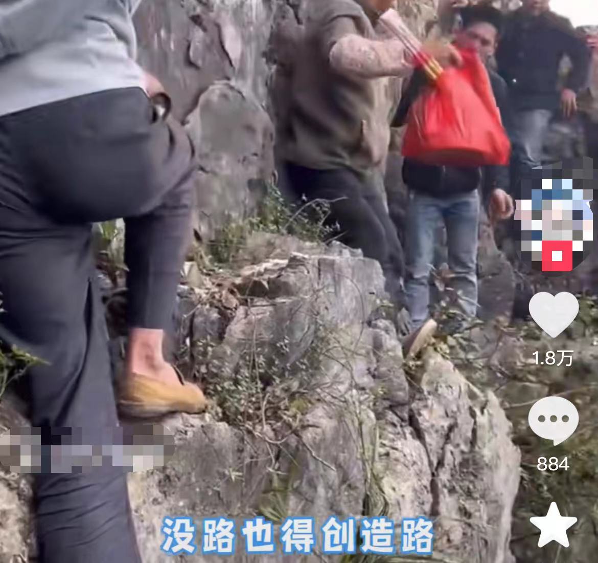 还有悬崖峭壁居然也能成为祭祖的行进路线之一,走这条路不仅要身体素质好,心理素质也得相当强大,目的地还没到就先给祖先们表演了一场祭祖版的“男生女生向前冲”。