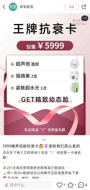 除此之外,财联社记者发现,在小红书上,账号“新氧医美”近日接连发帖称,“王牌抗衰卡”仅需5999可获得“超声炮面部+薇旖美2支+紧肤超水光1次”,活动时间2024年3月4日—2024年4月30日。且在首页检索时可发现该帖子封面右下角标注“赞助”二字。