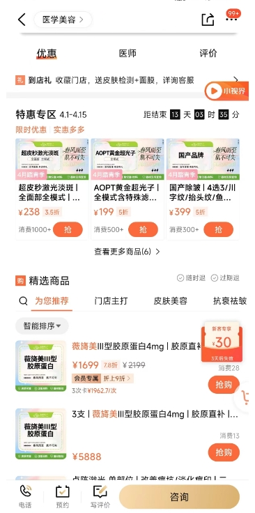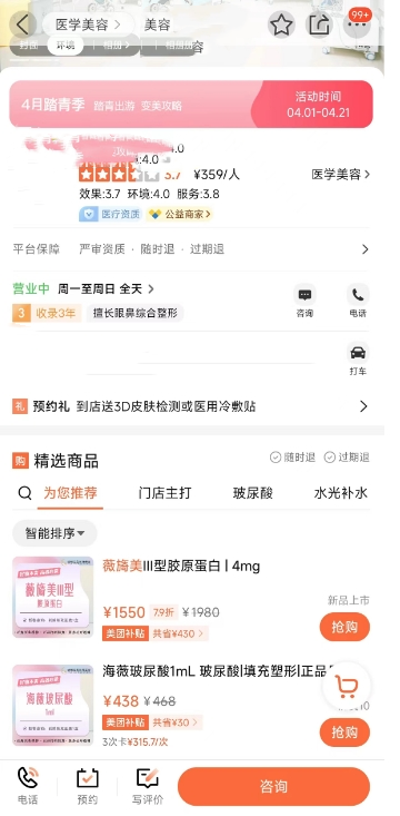 财联社记者发现,在美团、大众点评等APP上,薇旖美价格也远远低于公司指导的6800元/支,大众点评中可以看到有机构报价在1699元及1550元(美团补贴450元)不等,有客服表示,机构使用的是4mg极纯版,市面上大多数也是这款,另外还有一款至臻,10mg一支五六千。