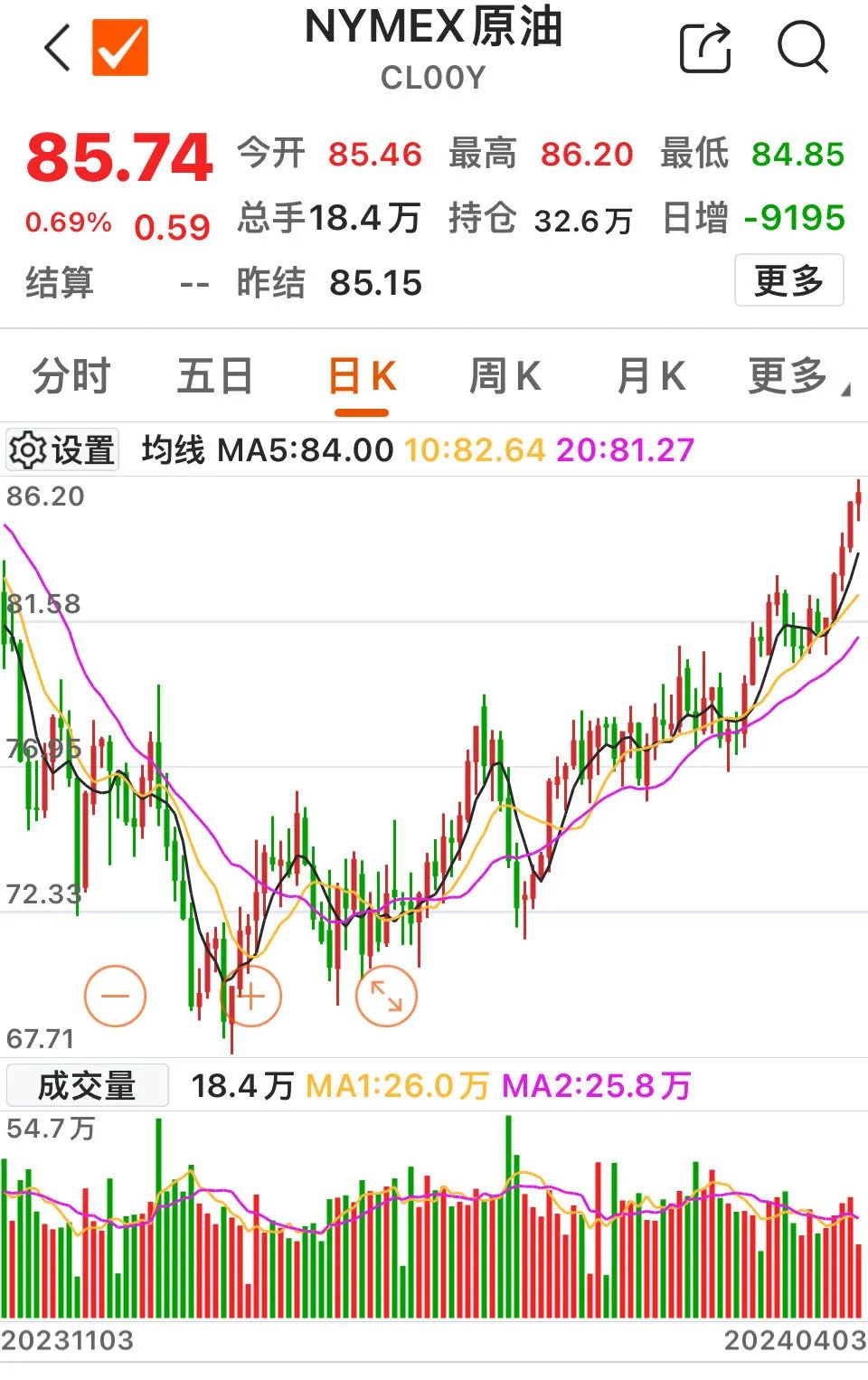 国际油价4月3日晚再度飙涨。截至北京时间4月3日晚23时,WTI原油报85.74美元/桶,盘中一度突破86美元/桶,创去年10月底以来新高,年内累计涨幅接近20%;布伦特原油报89.65美元/桶,逼近90美元关口,年内涨幅约16%。