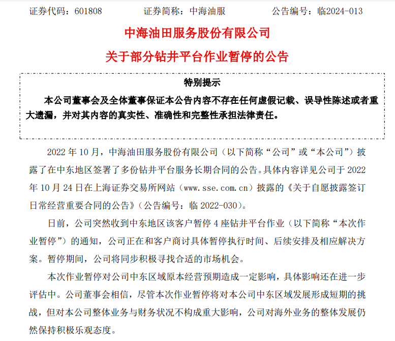 中海油服公告称,日前,公司突然收到中东地区客户暂停4座钻井平台作业的通知,公司正在和客户商讨具体暂停执行时间、后续安排及相应解决方案。本次作业暂停对公司中东区域原本经营预期造成一定影响,具体影响还在进一步评估中。