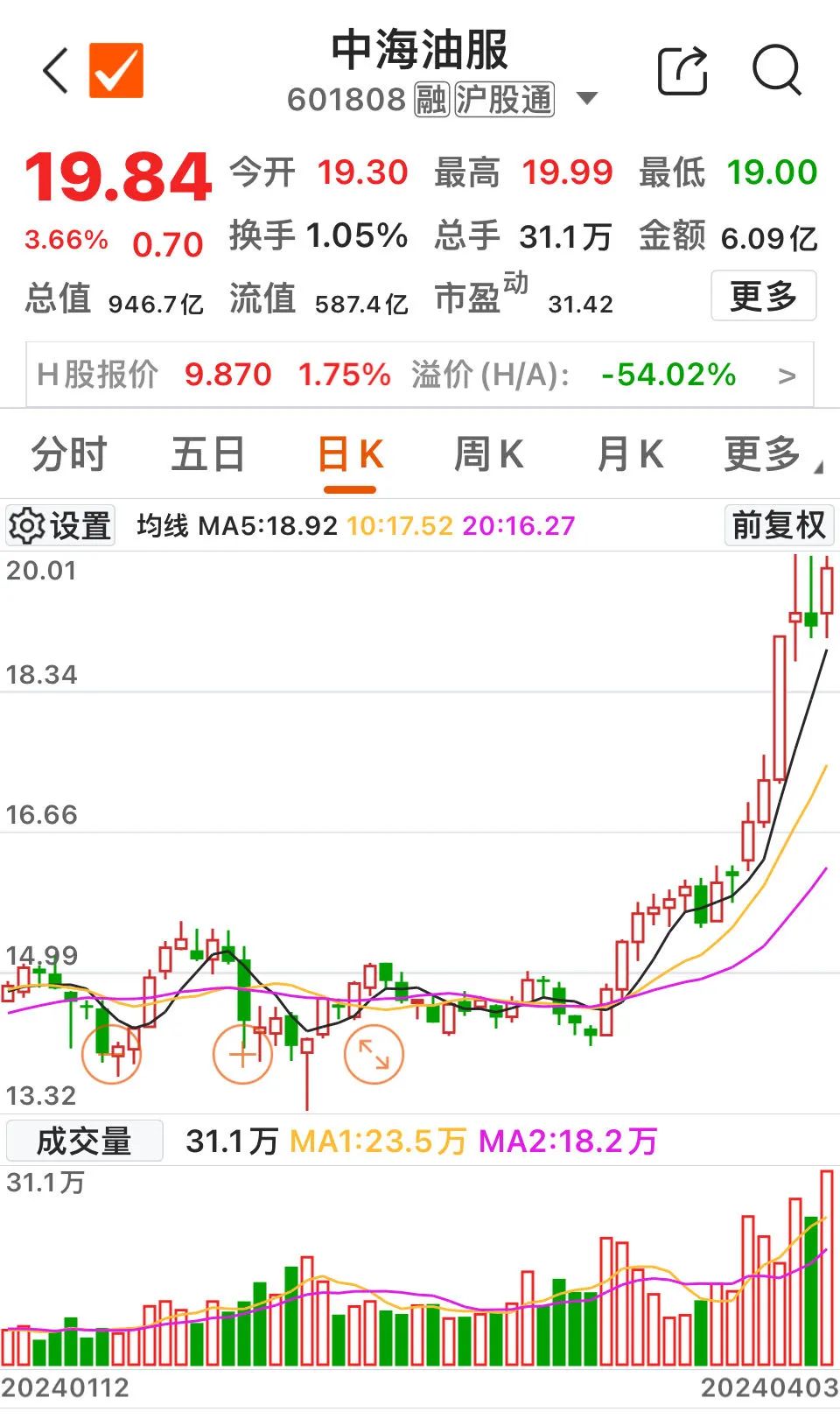 截至4月3日收盘,中海油服A股股价报19.84元/股,今年以来累计涨幅达35.70%,公司总市值946.7亿元。