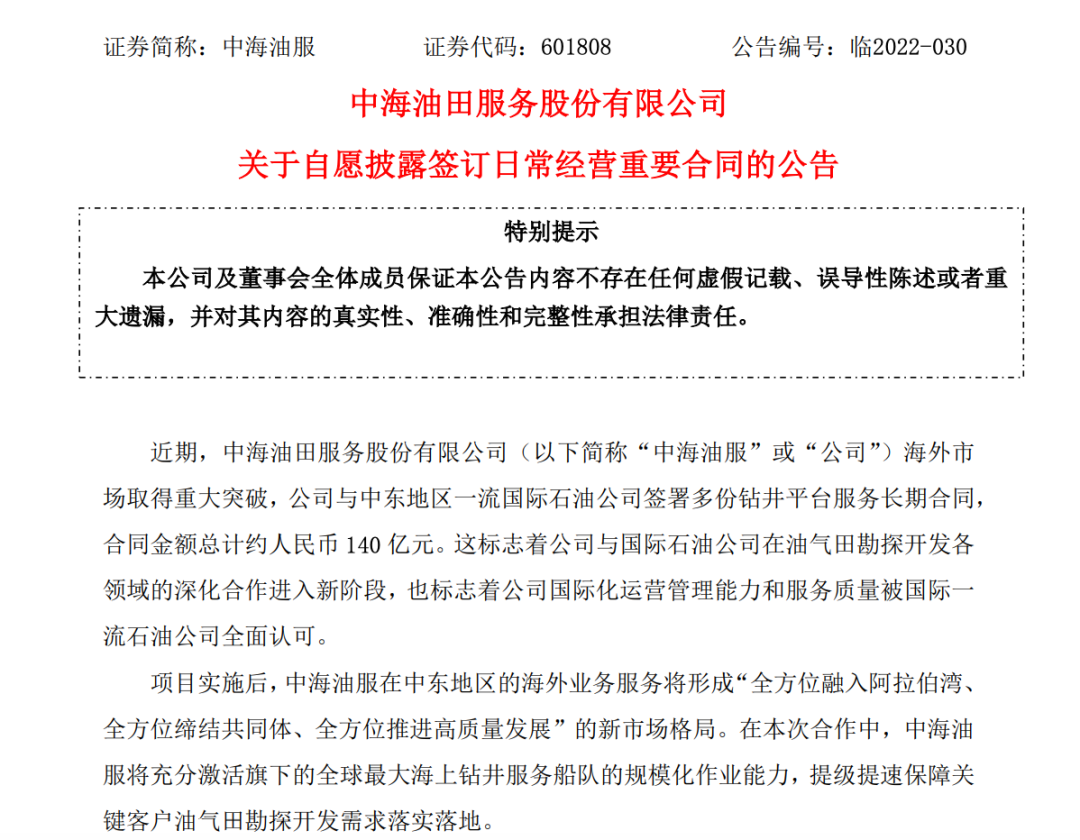 中海油服2022年10月24日披露的公告显示,中海油服在海外市场取得重大突破,公司与中东地区一流国际石油公司签署多份钻井平台服务长期合同,合同金额总计约人民币140亿元。