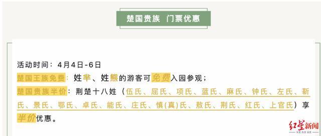 该景区发布的门票优惠政策称,4月4日至6日,楚国王族免费:姓芈、姓熊的游客可免费入园参观;楚国贵族半价:荆楚十八姓(伍氏、屈氏、项氏、蓝氏、麻氏、钟氏、左氏、靳氏、景氏、鄂氏、卓氏、能氏、庄氏、慎(真)氏、敖氏、荆氏、红氏、上官氏)享半价优惠。