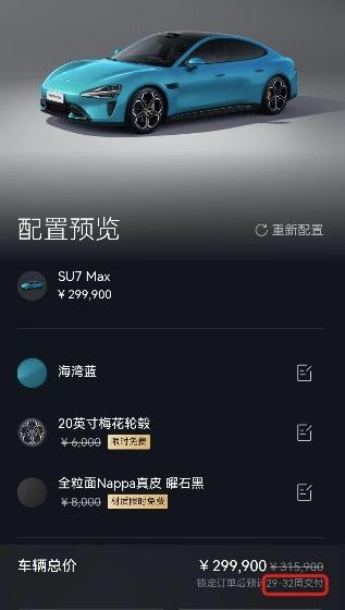 4月3日,记者查阅小米汽车APP发现,小米SU7标配版锁定订单后交付周期预计在21周~24周(5~6个月);Pro版锁单后交付周期预计为20~23周;Max高配版锁单后交付周期为29~32周(7.5~8个月)。