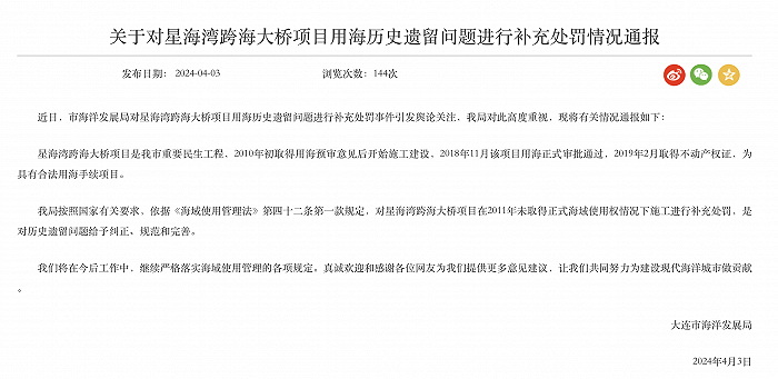 4月3日,大连市海洋发展局发布情况通报称,近日,市海洋发展局对星海湾跨海大桥项目用海历史遗留问题进行补充处罚事件引发舆论关注,我局对此高度重视,现将有关情况通报如下: