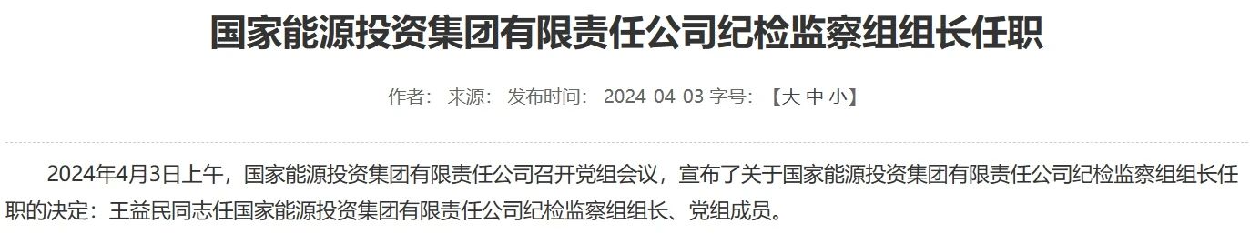4月3日上午,国家能源投资集团有限责任公司召开党组会议,宣布了关于国家能源投资集团有限责任公司纪检监察组组长任职的决定:王益民同志任国家能源投资集团有限责任公司纪检监察组组长、党组成员。