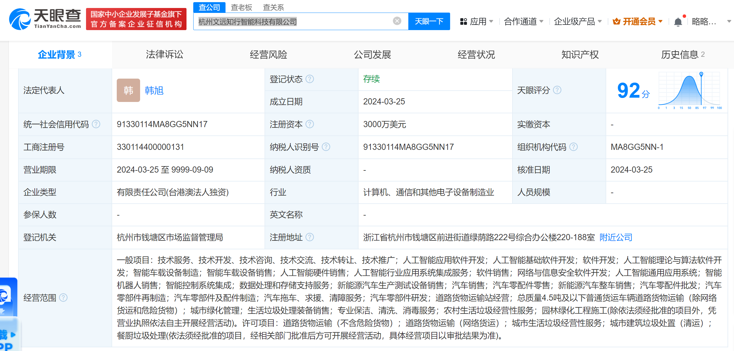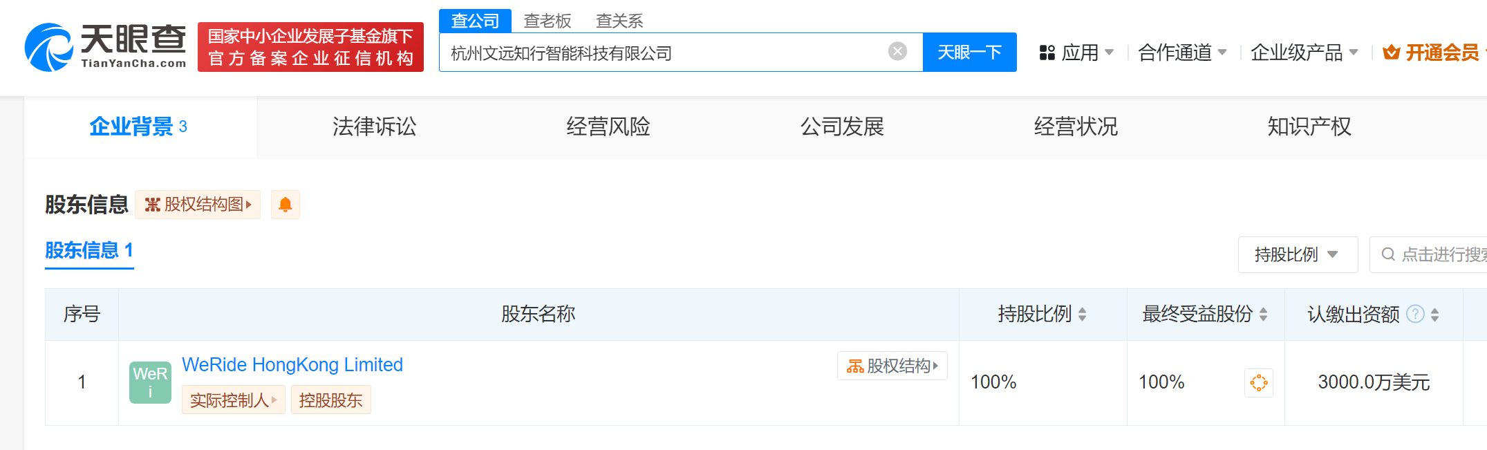 天眼查App显示,近日,杭州文远知行智能科技有限公司成立,法定代表人为韩旭,注册资本3000万美元,经营范围含人工智能应用软件开发,智能车载设备制造、销售,人工智能硬件销售,智能机器人销售,新能源汽车整车销售,汽车零部件研发等。股东信息显示,该公司由文远知行关联公司WeRide HongKong Limited全资持股。