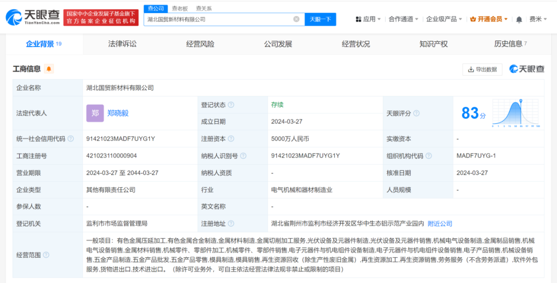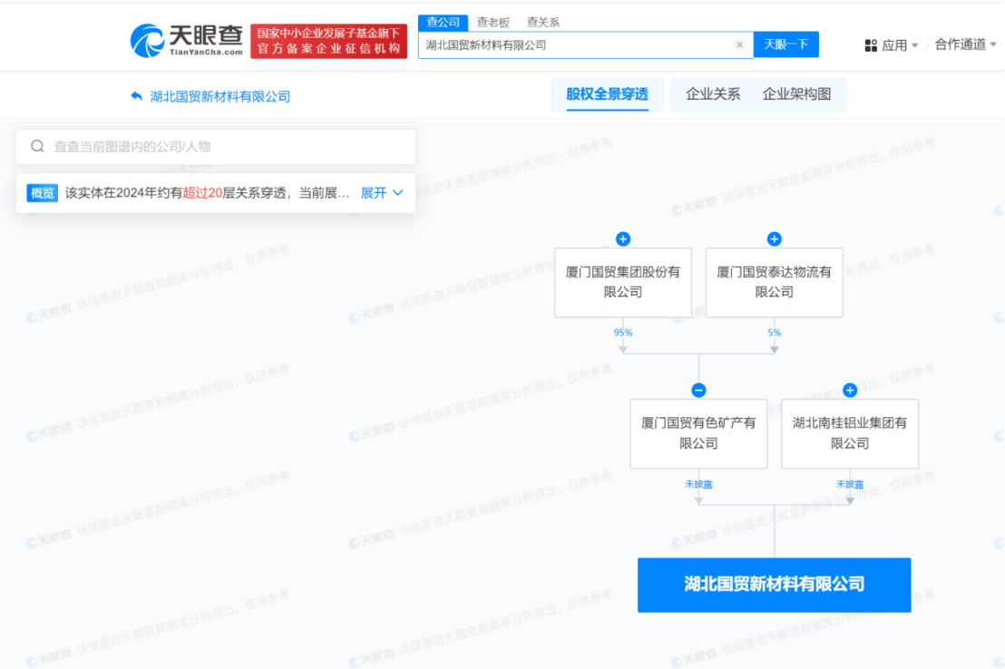 天眼查App显示,近日,湖北国贸新材料有限公司成立,法定代表人为郑晓毅,注册资本5000万人民币,经营范围含金属材料制造、光伏设备及元器件制造、机械电气设备制造、金属制品销售、电子元器件与机电组件设备制造等。股权全景穿透图显示,该公司由厦门国贸(600755)旗下厦门国贸有色矿产有限公司和湖北南桂铝业集团有限公司共同持股。