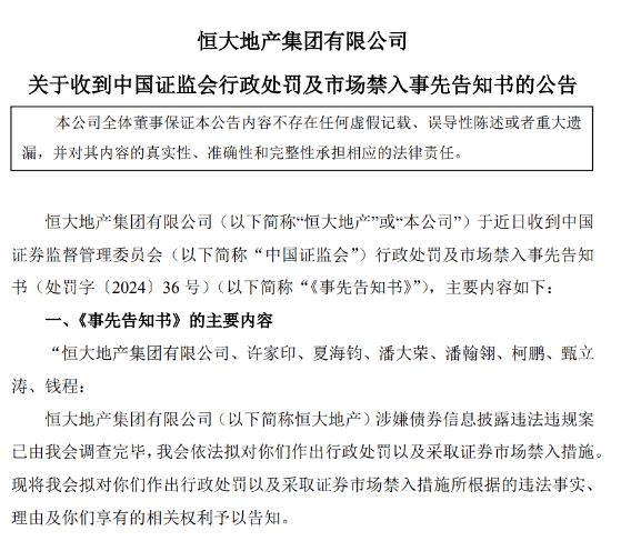 2024年3月18日晚间,恒大地产发布了关于收到证监会行政处罚及市场禁入事先告知书的公告,将对恒大地产、许家印、夏海钧、潘大荣、潘翰翎、柯鹏、甄立涛、钱程进行罚款和市场禁入等行政处罚。