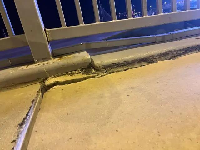 大连市市政公用事业服务中心桥涵管理所工作人员表示,此前确实有市民反映,星海湾跨海大桥入市方向8号路灯杆附近,大桥路面有裂缝,另外人行步道沉降现象严重,担心有安全隐患。接到市民反映的问题后,桥涵管理所联合星海湾跨海大桥设计单位、检测单位等有关人员立即到场查看。经过检查,专家发现桥面出现裂缝的位置是桥梁和路面的衔接处,也被称为伸缩缝。