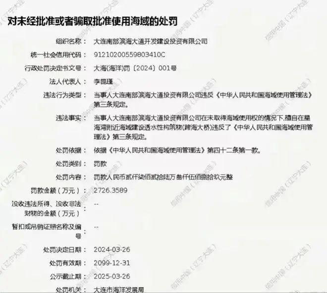 处罚通告称,依据《海域使用管理法》第四十二条第一款,对上述公司处以罚款2726.3589万元。处罚决定日期为2024年3月26日,处罚机关为大连市海洋发展局。