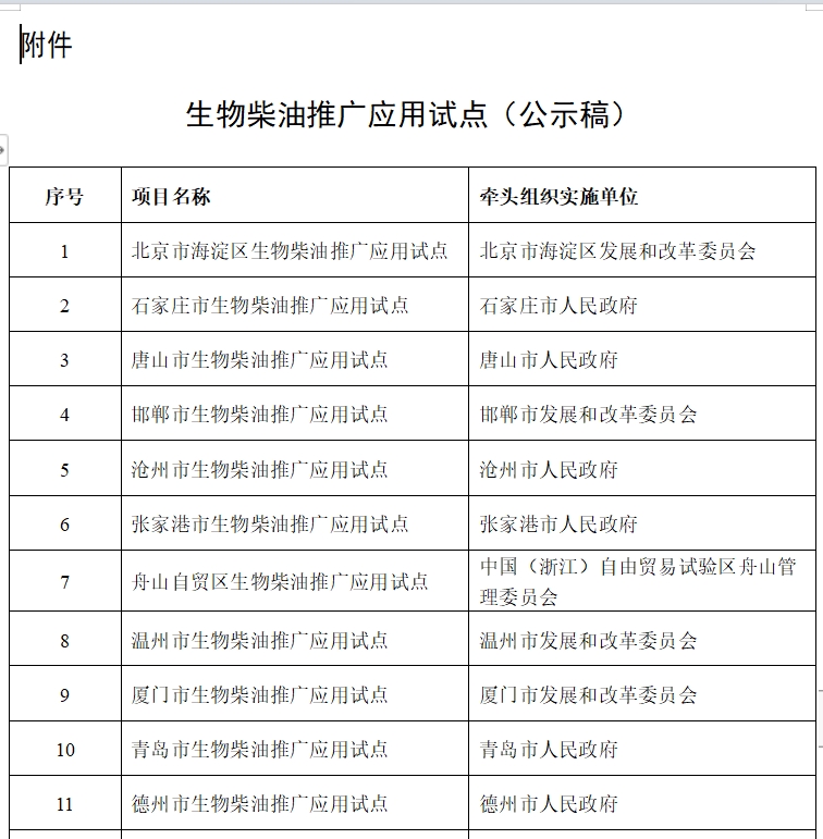 国家能源局消息,近日,国家能源局综合司发布《关于公示生物柴油推广应用试点的通知》。通知称,为贯彻新发展理念,推进废弃物循环利用,加快能源绿色低碳转型,拓展国内生物柴油的应用场景,探索建立可复制、可推广的发展路径、政策体系,逐步形成示范效应和规模效应,我局组织了生物柴油推广应用试点申报及评审工作。根据《国家能源局技术示范和改革试点工作管理办法》(国能综通法改〔2023〕61号)等有关要求,经组织专家评审和复核,原则支持山东省德州市等单位开展生物柴油推广应用试点工作,现予公示。