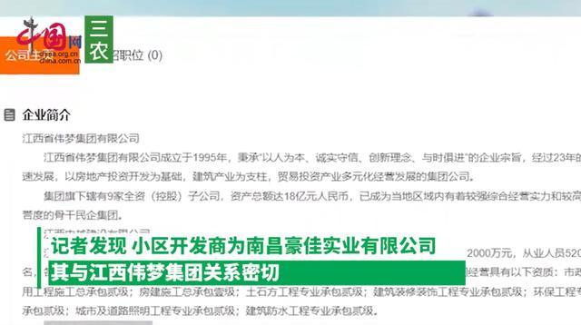 据中国网报道,小区开发商为南昌豪佳实业有限公司,其与江西伟梦集团关系密切。江西伟梦集团原董事长李梦平曾涉胡长清案,出狱后又重操旧业,在今年初该省警示片上被点名。