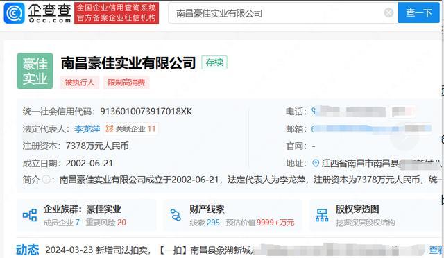 记者查询企查查APP,显示南昌豪佳实业有限公司成立于2002年6月,法定代表人李龙萍,注册资本7378万元。