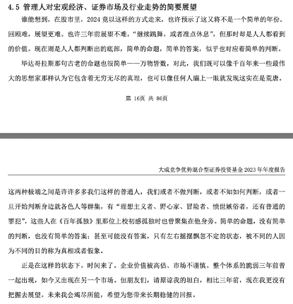 基金经理的“小作文”是公募基金年报的重要看点。2023年公募基金年报披露完毕,大成基金徐彦的“小作文”则因独特文风出圈。