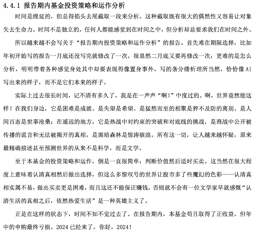 接下来,徐彦讲到越来越不会写关于“报告期内投资策略和运作分析”的报告。他写道,“首先难在期限选择,比如年初开始写的报告,一月底还没写完就修改了一次,很显然二月底又要再修改一次;更难的是怎么分析,明明带着各种感觉身处其中却要表现得像置身事外,写的条分缕析理所当然,恰恰像AI写出来的样子,而不是它们本来的样子。”