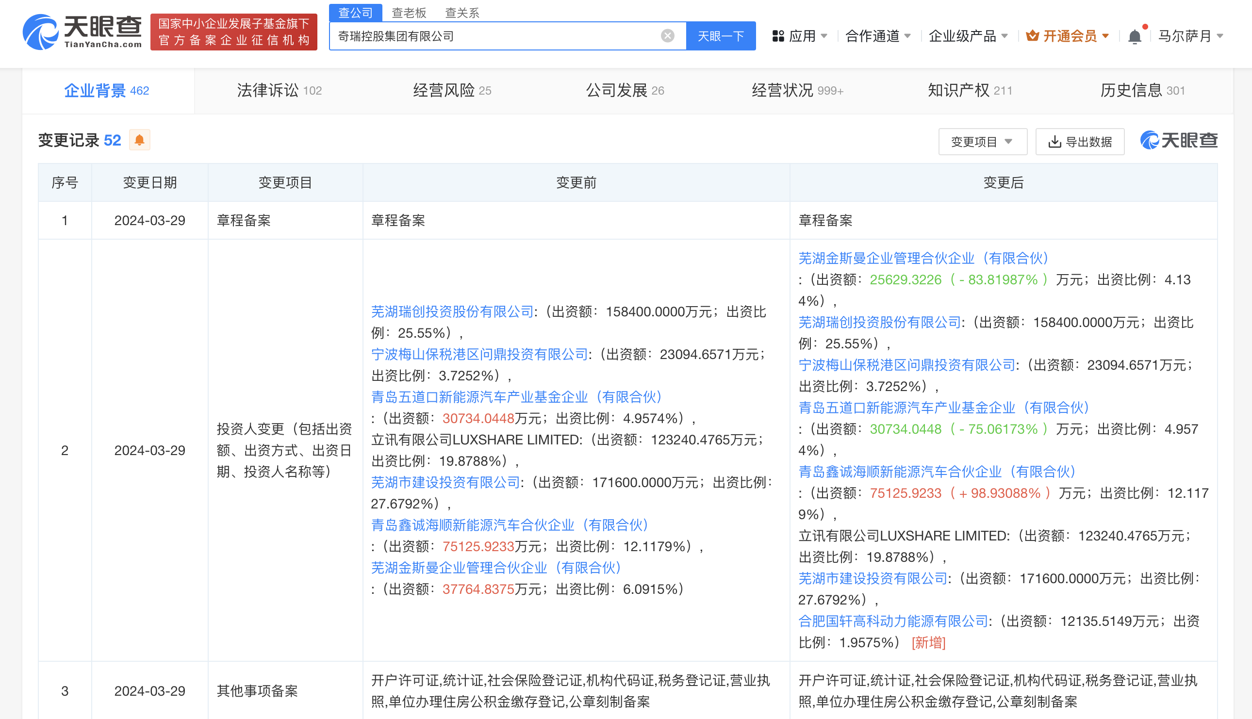 天眼查App显示,近日,奇瑞控股集团有限公司发生工商变更,股东新增国轩高科(002074)旗下合肥国轩高科动力能源有限公司。