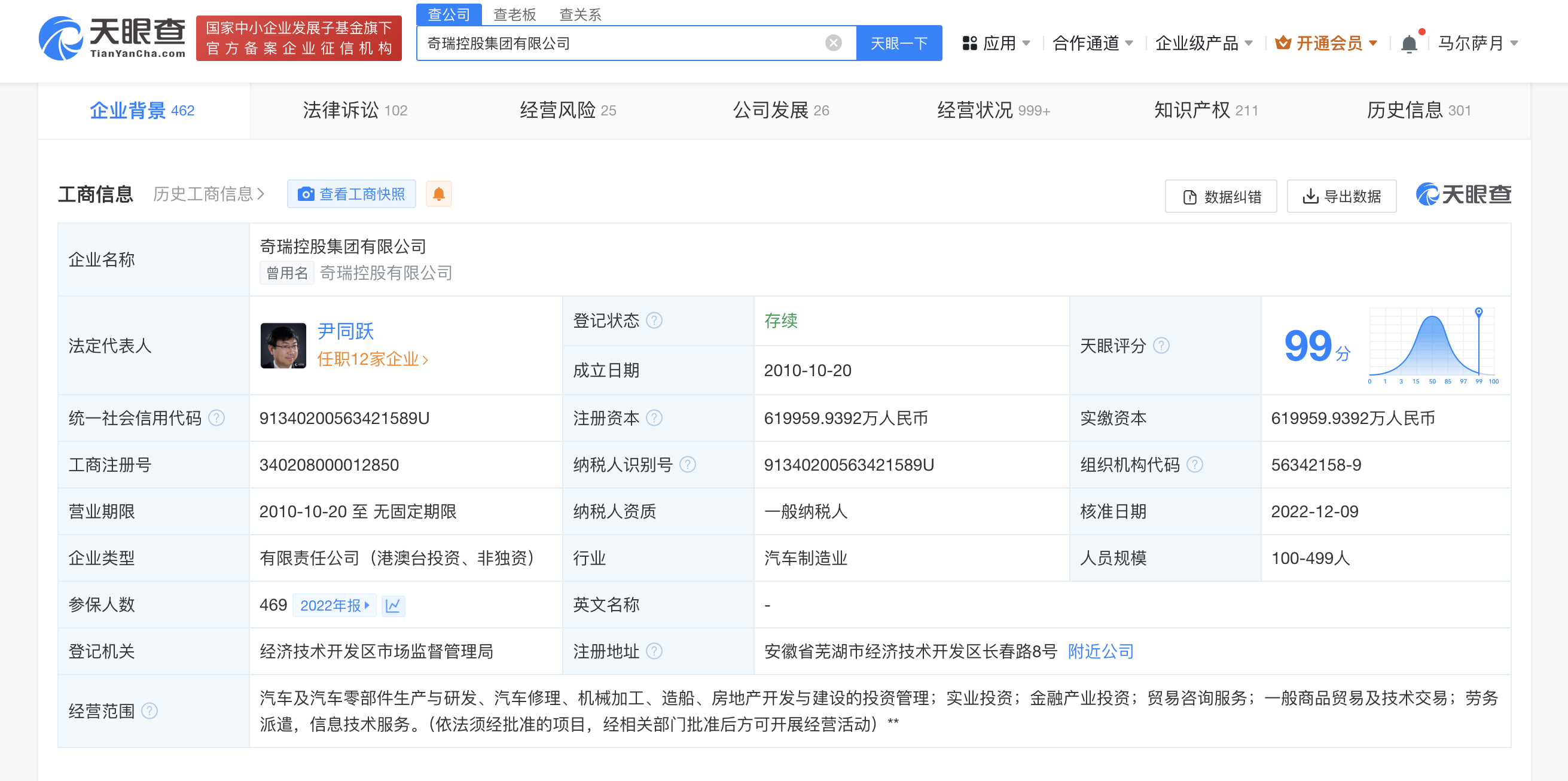 奇瑞控股集团有限公司成立于2010年10月,法定代表人为尹同跃,注册资本约62亿,经营范围含汽车及汽车零部件生产与研发、汽车修理、机械加工、造船、房地产开发与建设的投资管理等。